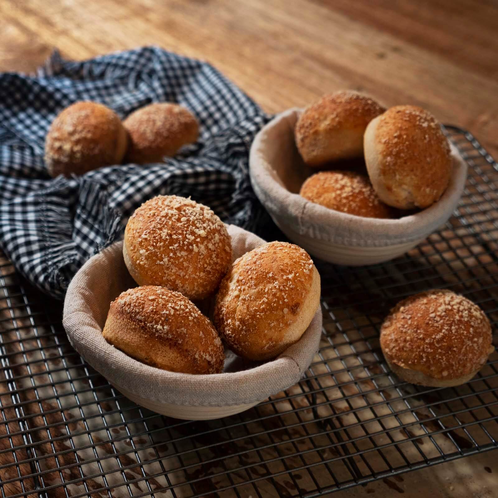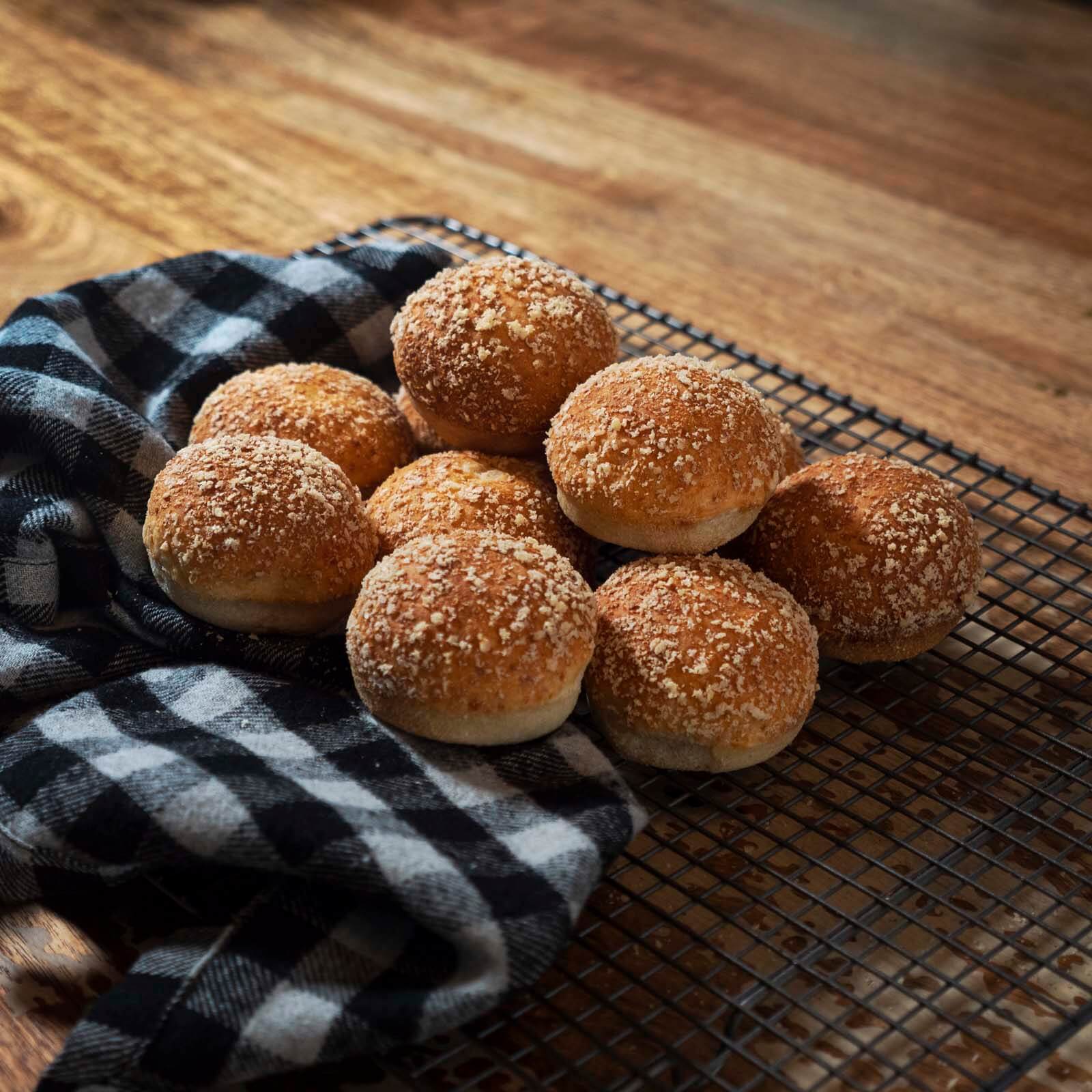 Es un bollito clásico con una capa superior, deliciosa y crocante de queso parmesano, se caracteriza por su miga ligera, suave y esponjosa.