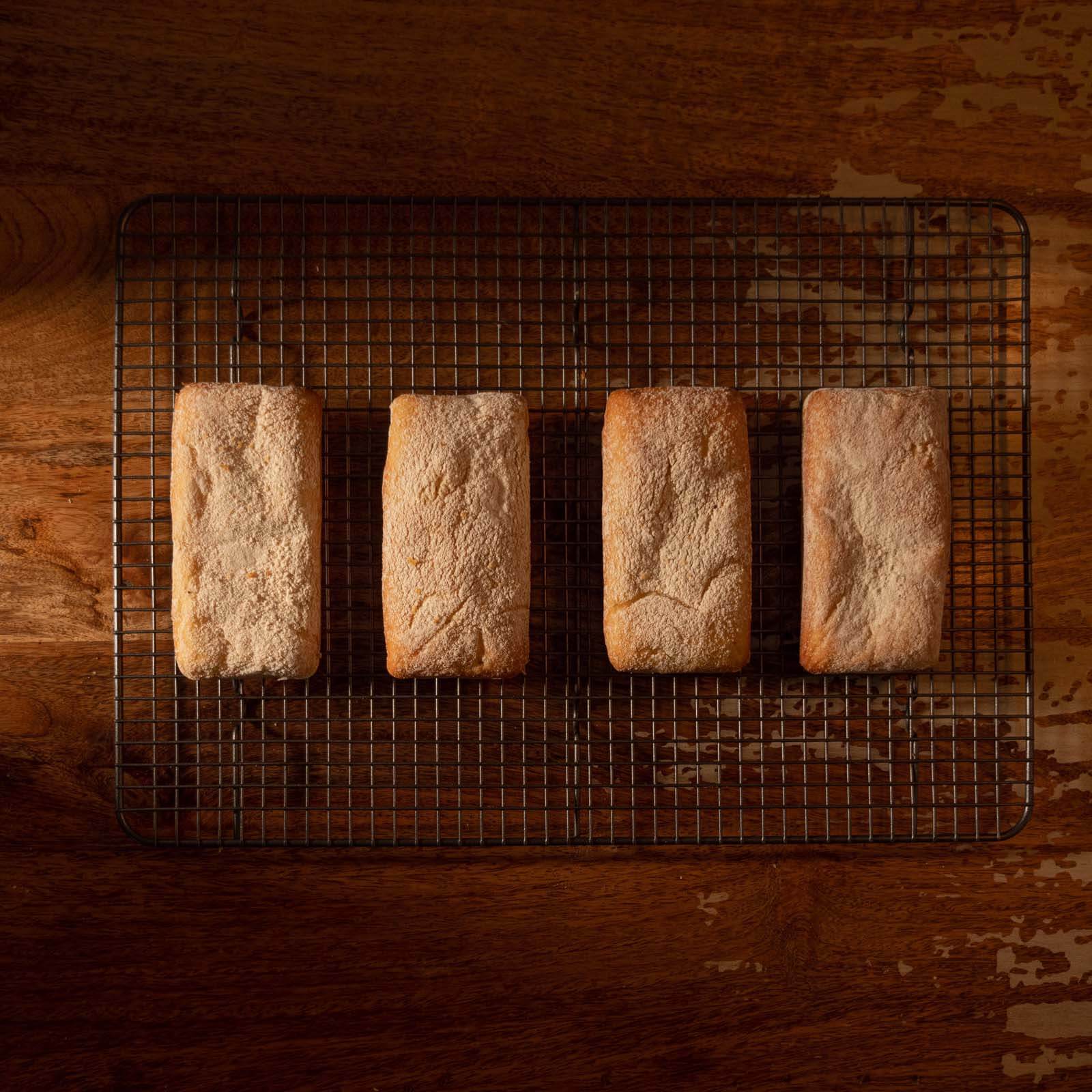 Esta receta provee las mejores características de un ciabatta italiano, requiere de un porcentaje de agua para lograr un nivel alto de hidratación que produce que sea suave y de textura ligera. Es un pan ideal para preparaciones gourmets.