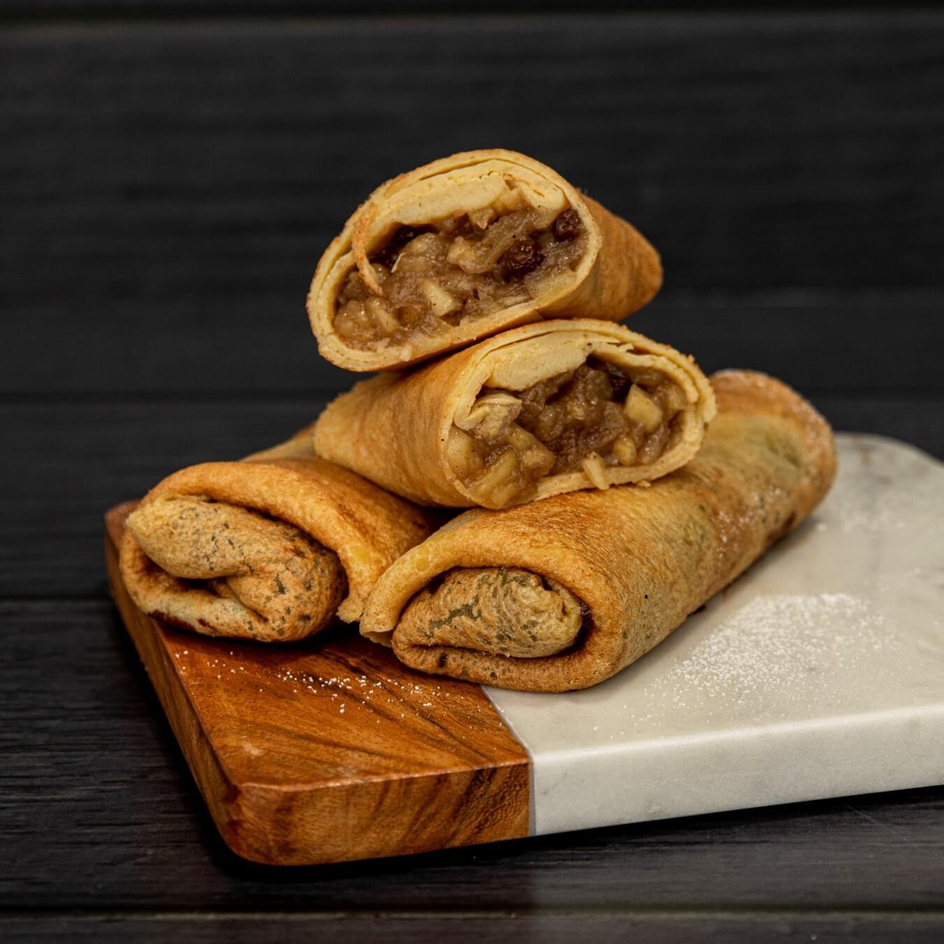 Goza nuestra deliciosa crepa de manzanas, pasas y brandy. Rica combinación!!! Animará tu corazón