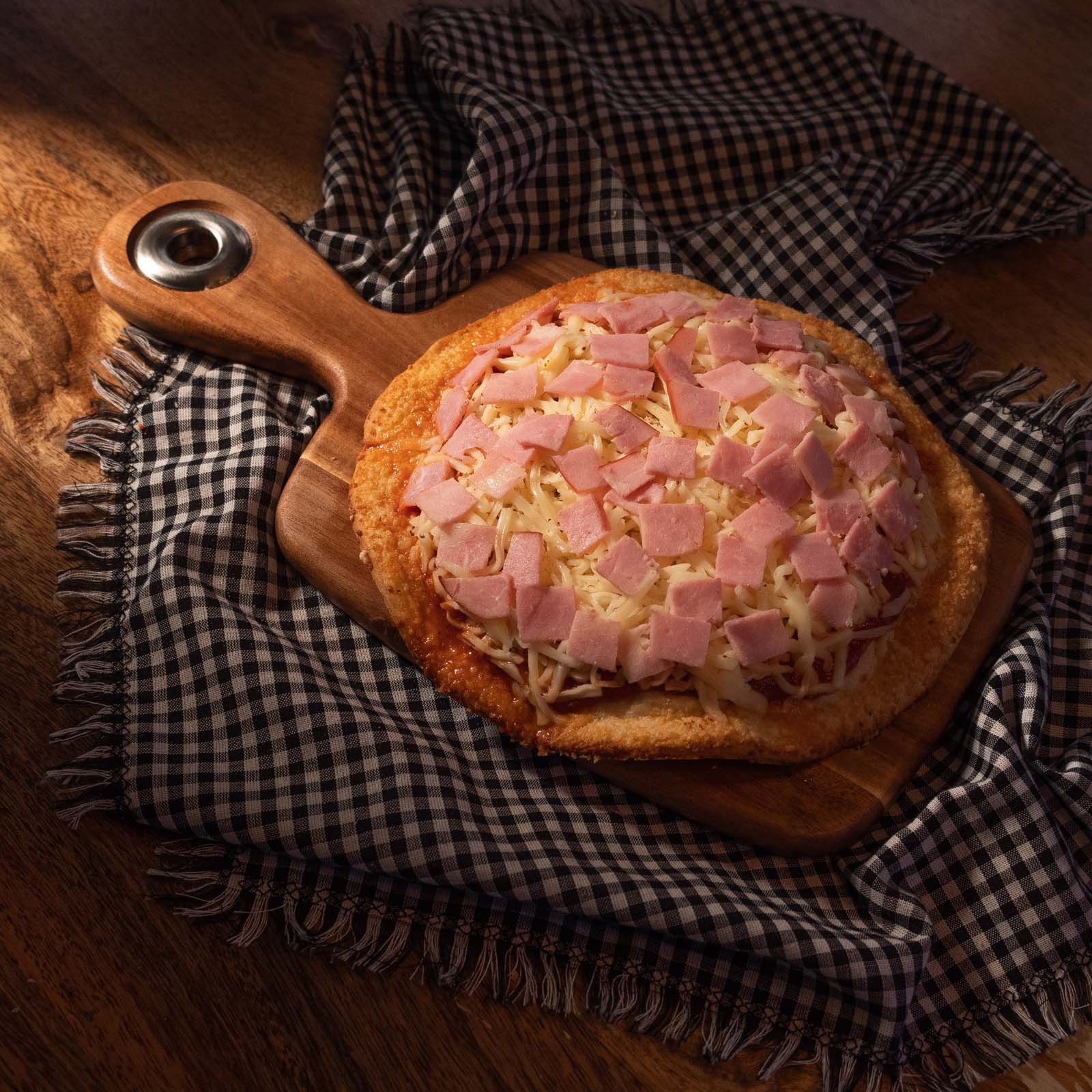 Lo irresistible de esta pizza es la combinación perfecta de masa, con nuestra salsa de ingredientes frescos y aromáticos, tiene una consistencia espesa y un perfecto equilibrio entre la acidez del tomate, ajo y cebolla, terminándola de sellar con una capa bondadosa de queso mozarela y jamón de pavo.
